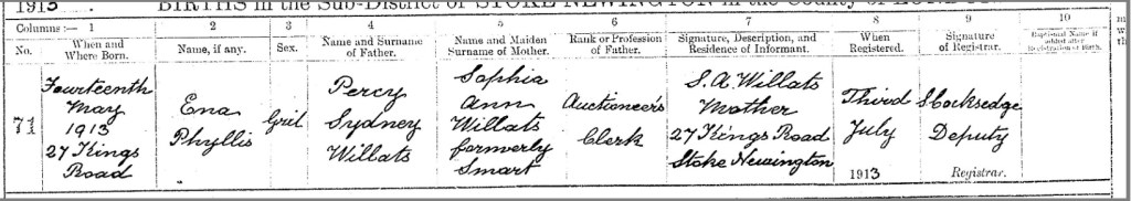 Jumping forward to 1913, Percy and Sophia, daughter Ena Phyllis Willats was born on Wednesday the 14th of May 1913, at the family’s home, Number 27, Kings Road, Stoke Newington, Middlesex, England. Ena mum Sophia, registered her birth on Thursday the 3rd of July 1913. Sophia gave her husband Percy’s occupation as an auctioneer clark, and their abode as Number 27, Kings Road, Stoke Newington.