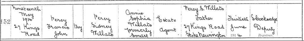 The following year, Percy and Sophia, were once again expecting, their son, Percy Francis John Willats, was born on Tuesday the 19th of May 1914, at the family home, Number 27, Kings Road, Stoke Newington, Middlesex, England.
