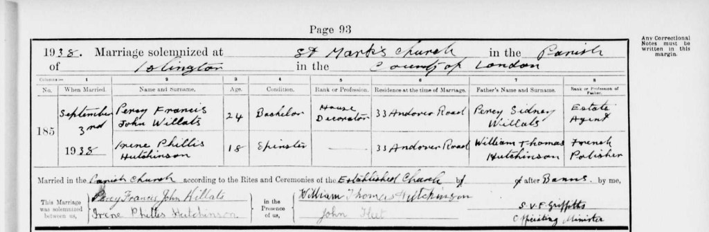 Percy and Sophia son, Percy Francis John Willats and his fiance Irene Phillis Hutchinson,marriage banns were read at St Marks Church, Tollington Park, Islington, Middlesex, England, on Sunday the 14th, 21st and 28th days of August 1938.