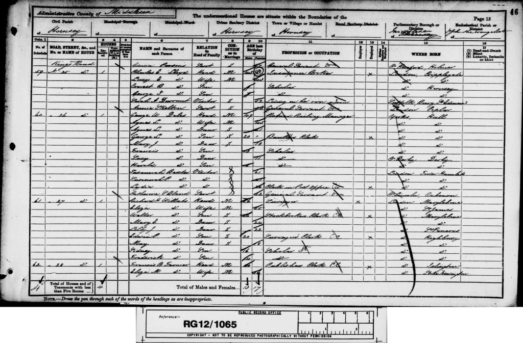 On Sunday, April 3rd, 1881, the census was taken, capturing a snapshot of Frederick Howard Willats' family life during that time. The family resided at Number 61, Ambler Road, Islington, Middlesex, England, a home filled with both the busyness and warmth of a large household.
