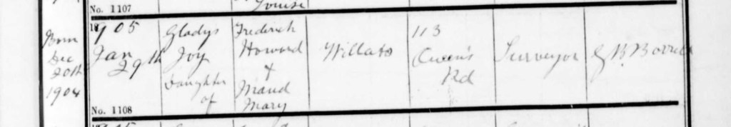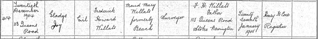 Before long, Maude found herself expecting a child, bringing new joy and anticipation into their lives. On a crisp winter day, Tuesday, December 20, 1904, their daughter, Gladys Joy Willats, made her debut into the world. She was born at the family’s home, a modest but warm residence at Number 113 Queens Road, in Stoke Newington, Hackney, Middlesex, England.