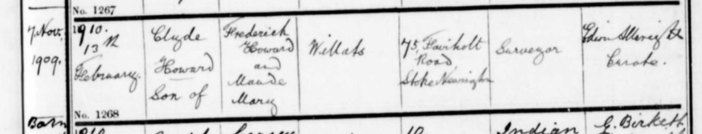 Just a few short months after Percy and Sophie’s wedding, Frederick and Maud were blessed with a joyous occasion of their own. On a crisp Sunday, November 7, 1909, their son, Clyde Howard Willats, was born, filling their home with the unmistakable joy and wonder that only the arrival of a child can bring. He came into the world at Number 75 Fairholt Road, Stoke Newington, Middlesex, England, a place that was surely brimming with excitement as the couple welcomed their second child.