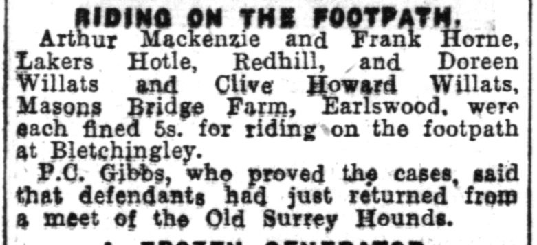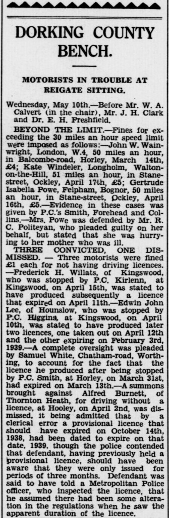 Wednesday, May 10th.-Before Mr. W. A. Calvert (In the chair), Mr. J. H. Clark and Dr. E. H. Freshfield. BEYOND THE LIMIT.- Fines for exceeding the 30 miles an hour speed limit were imposed as follows:-John W. Wainwright, London, W.4, 50 miles an hour, in Balcombe-road, Horley, March 14th, £4; Kate Windeler, Longholm, Walton-on -the-hill, 51 miles an hour, in Stane-street, Ockley, April 17th, 45; Gertrude Isabelle Powe, Felpham, Bogar, 50 miles an hour Stane-street, Ockley, April 16th, £5.-Evidence in these cases was given by P.C.'s Smith, Forehead and Collins.-Mrs. Powe was defended by Mr. R. C. Politeyan, who pleaded guilty on her behalf, but stated that she was hurrying to her mother who was ill. THREE CONVICTED, ONE DISMISSED. - Three motorists were fined £1 each for not having driving licences. —Frederick H. Willats, of Kingswood, who was stopped by P.C. Kirlenn, at Kingswood, on April 15th, was stated to have produced subsequently a licence that expired on April 11th.- Edwin John Lee, of Hounslow, who was stopped by P.C. Higgins, at Kingswood, on April 10th, was stated to the produced later two licenses one taken out on April 12th and the other expiring on February 3rd, 1939.— A complete oversight was pleaded by Samuel White, Chatham-road, Worthing, to account for the fact that the licence he produced after being stopped by P.C. Smith, at Horley, on March 31st, had expired on March 13th.- A summons brought against Alfred Burnett, of Thornton Heath, for driving without a licence, at Hooley, on April 2nd, was dismissed, it being admitted that by a clerical error a provisional licence that should have expired on October 14th, 1938, had been dated to expire on that date, 1939, though the police contended that defendant, having previously held a provisional licence, should have been aware that they were only issued for periods of three months. Defendant was said to have told a Metropolitan Police officer, who inspected the licence, he assumed there had been some alteration in the regulations when he saw the apparent duration of the licence.