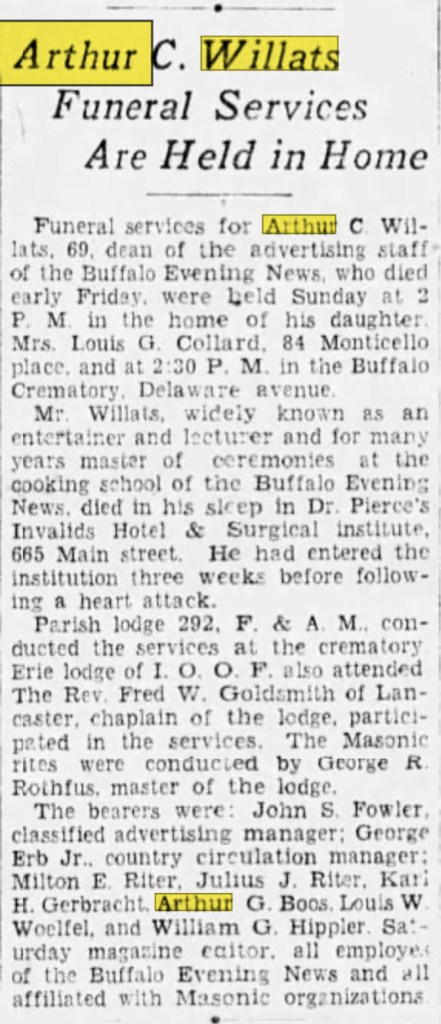 The article beautifully captured Arthur’s legacy: *"BUFFALO, June 2 – Arthur C. Willats, 69 years old, well-known Buffalo lecturer and former Shakespearean actor, died in Dr. Pierce’s Invalids Hotel and Surgical Institute, 665 Main Street, early this morning. He had been in the institution since suffering a heart attack three weeks ago. Mr. Willats was born in England and, after coming to this country at the age of 17, he toured the United States as an actor, settling in Buffalo 50 years ago. He was engaged as a lecturer at the old Buffalo Cyclorama for many years and had been a member of the staff of the Buffalo Evening News for 40 years. He had also recently lectured over the radio. He is survived by a son, Richard H. Willats, Buffalo automobile distributor, and a daughter, Mrs. Louis G. Collard, 84 Monticello Place."*