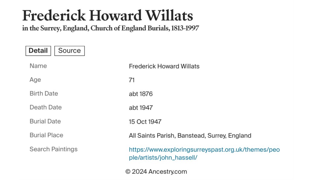 With profound respect and heartfelt remembrance, Frederick Howard Willats was lovingly laid to rest at All Saints Parish, Banstead, Surrey, England, on Wednesday, 15th October 1947.