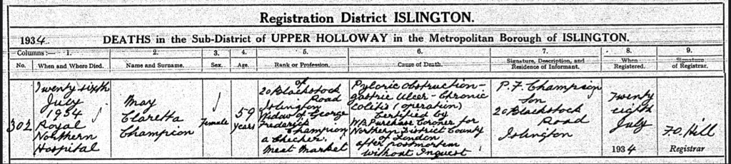 The sorrow that had already touched the Willats family deepened further when Frederick’s dear sister, 57-year-old May Claretta Champion (née Willats), passed away on Thursday, the 26th of July, 1934. May, the widow of George Frederick Champion, who had worked in the chicken meat market, had lived at 20 Blackstock Road, Islington, London. She had been struggling with health issues for some time, and her death followed complications from pyloric obstruction, a gastric ulcer, and chronic colitis, which had required surgery. Despite the efforts made to heal her, her body could no longer fight the toll these conditions had taken.