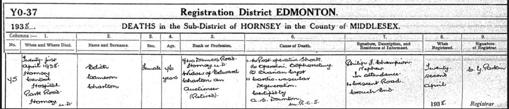 With heavy hearts, I share the deeply sorrowful passing of Frederick’s beloved sister, Edith Cameron Charlton, née Willats. Edith, aged 46, had long been a source of strength and love for her family, though life had not been kind in her later years. The widow of Edward Charlton, an auctioneer, Edith had lived a life full of love, challenges, and perseverance. She passed away on Thursday, the 21st of April 1938, at the Hornsey Central Hospital in Park Road, Hornsey, Edmonton, Middlesex.
