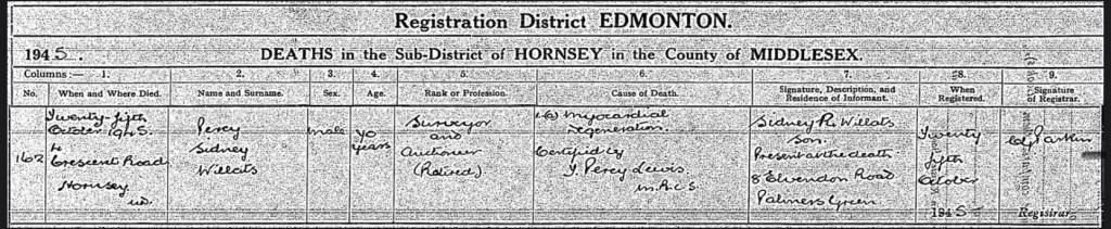 It is with deep sadness that we remember the passing of Percy Sidney Willats, beloved brother of Frederick, who left this world at the age of 70. Percy, a retired surveyor and auctioneer, passed away peacefully at his home, Number 4, Crescent Road, Hornsey, Middlesex, on Thursday, the 25th of October, 1945. His death was attributed to Myocardial Degeneration, a condition that ultimately took him from his family and those who knew him.