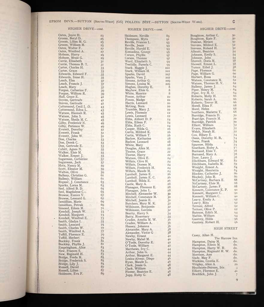 The next record I have for Frederick and his family is from the 1945 Sutton, Surrey, England Electoral Register. It shows that Frederick, along with his wife Maud, and their children Doreen andClive/Clyde, were living at Number 24 Higher Drive, located in the peaceful area of Banstead, within the lovely borough of Sutton and Cheam, Surrey, England.