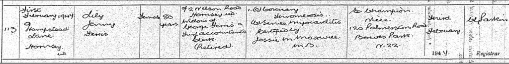 Frederick’s sister, Lily Jenny Ferris (née Neilson, formerly Willats), passed away at the age of 80 on Saturday, the 1st of February, 1947. At the time of her death, she was living at Number 9, Hampstead Lane, Hornsey, Middlesex, England. Lily, the widow of George Ferris, a retired first accountant clerk, had spent her final years in the same area she had called home for so much of her life.