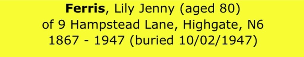 Frederick's sister, Lilly Jenny Ferris (née Neilson, formerly Willats), was laid to rest on Monday, the 10th of February, 1947, at Abney Park Cemetery, located at 215 Stoke Newington High Street, Stoke Newington, London, England, N16 0LH.