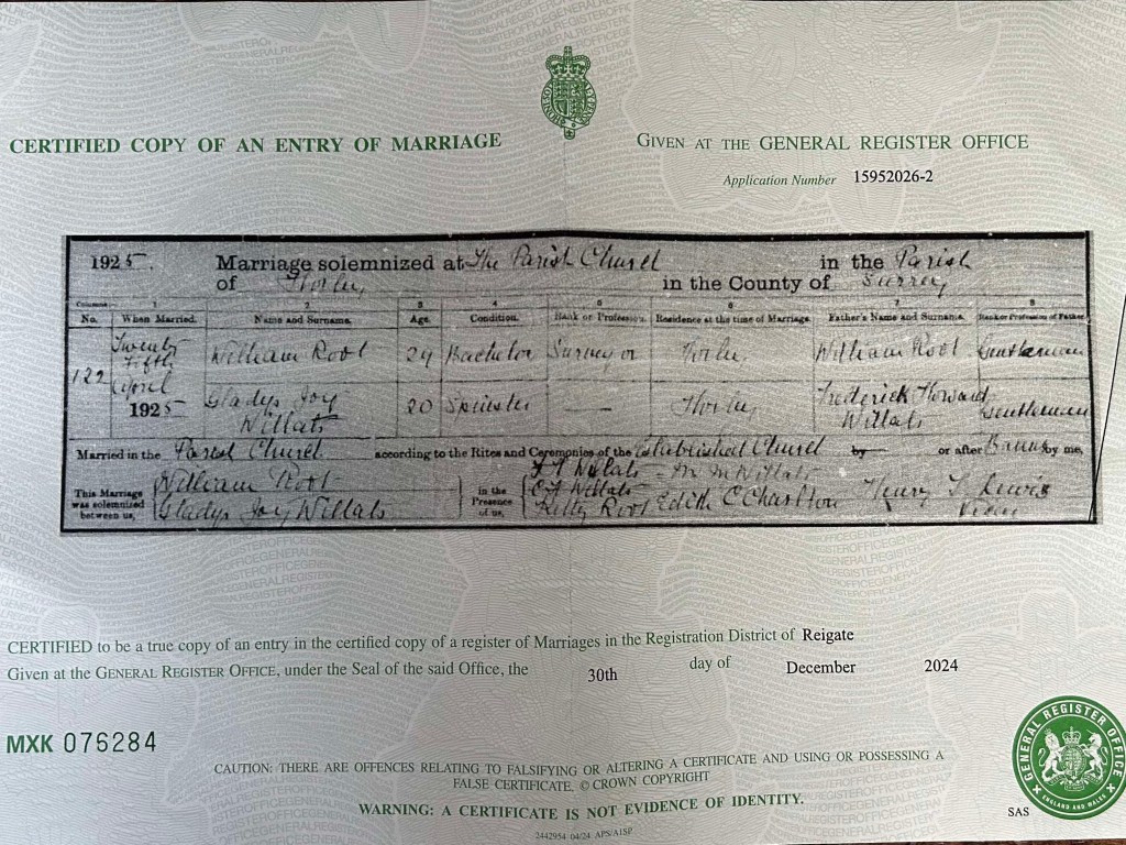 On a spring day, the 20th day of April, 1944, at the charming All Saints Church in Banstead, Surrey, Clyde Howard Willats, Frederick’s 33-year-old son and a production engineer living on High Street, Banstead, took a life-changing step. He married Olive Elizabeth Wildred Watson, a bright and beautiful 23-year-old who lived at 24 Higher Drive, Banstead.