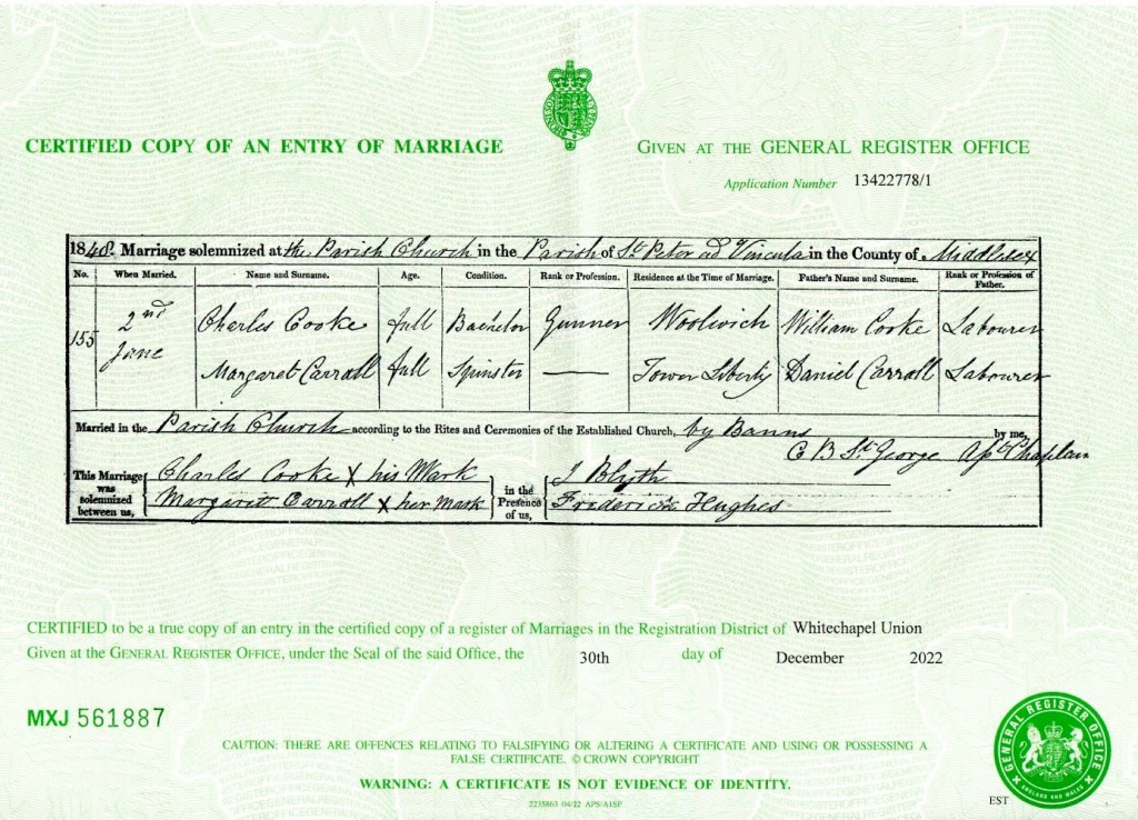 On June 2, 1848, Margarita Carroll, recorded as Margaret, took a significant step in her life when she married Charles Cooke (also recorded as Cook), a gunner in the British Army. The ceremony took place at The Chapel of St Peter ad Vincula in Whitechapel, Middlesex, England—a place steeped in history and solemnity, tucked within the ancient walls of the Tower of London.