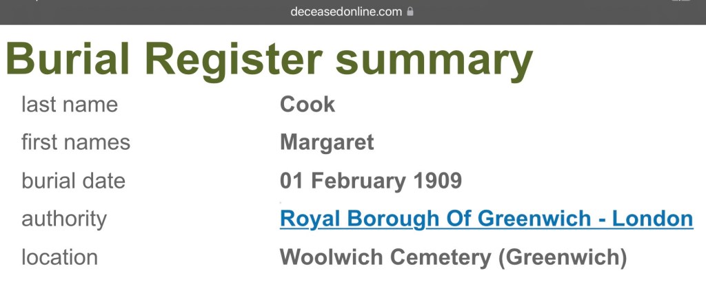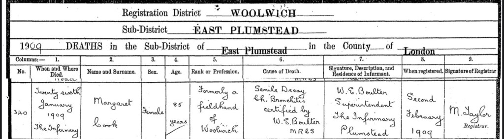 Sadly, this is where Margarita’s story comes to an end. On Thursday, the 26th of January, 1909, Margarita passed away at the Infirmary in Plumstead, London, England. She was 84 years old. Her death was attributed to the ravages of senile decay and bronchitis, conditions that had taken their toll on her body after many years of hardship.