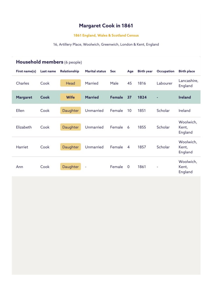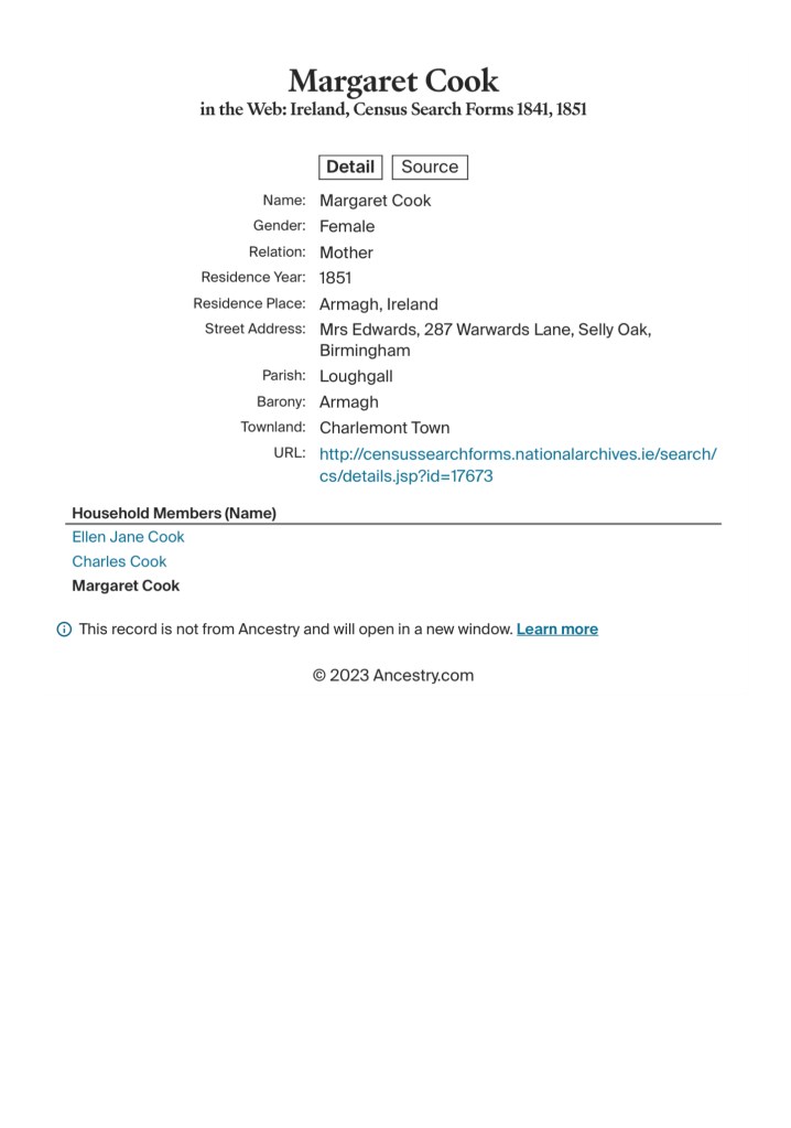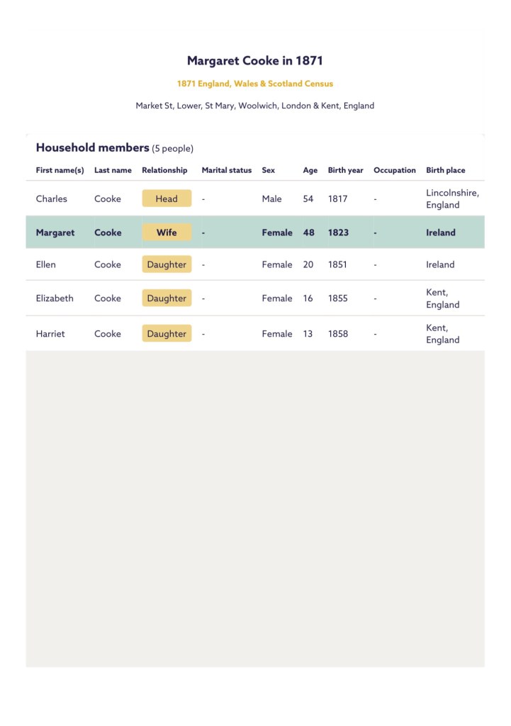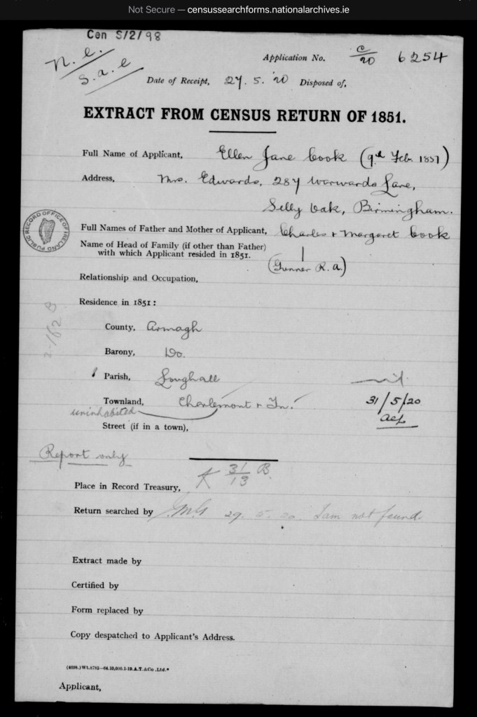 After much searching, I finally uncovered an incredible find: Margarita, Charles, and their daughter Ellen Jane Cook appear in an extract from the 1851 Ireland Census. This rare document offers a fleeting but precious glimpse into their lives on March 30, 1851.