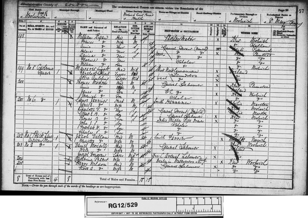 Waites Cottages in Woolwich, Kent, were modest dwellings that housed working-class families during the 19th century. These cottages were situated in a bustling area known for its industrial and military significance, particularly due to the presence of the Royal Arsenal, a major munitions factory. The cottages themselves were likely constructed to accommodate the influx of workers drawn to Woolwich by employment opportunities in the Arsenal and related industries.
