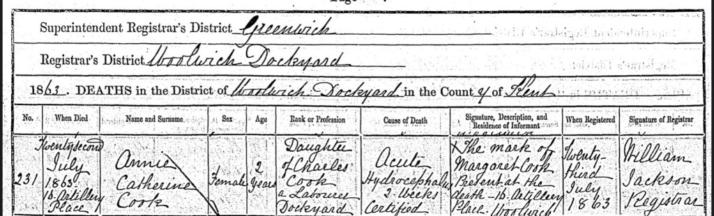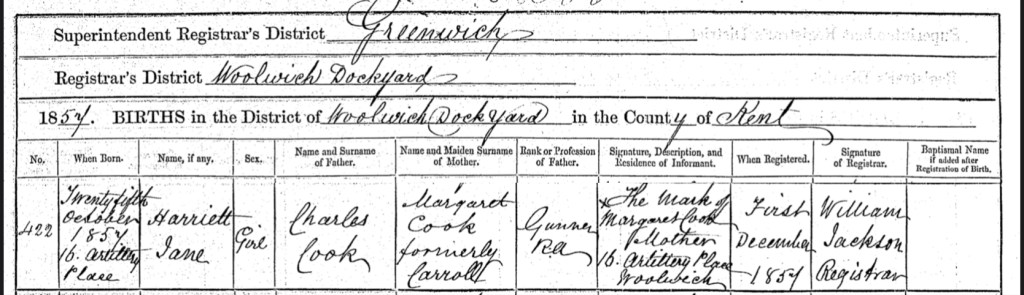 On Sunday, October 25, 1857, Margarita gave birth to their daughter, Henrietta Jane Cook, at number 16, Artillery Place, Woolwich, Kent, England. This was another significant addition to Margarita and Charles’s growing family. Just over a month later, on Tuesday, December 1, 1857, Margarita registered Henrietta’s birth in Greenwich.