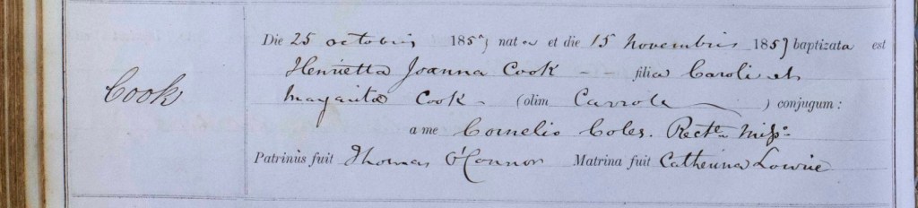 Henrietta was baptized under the name Henrietta Joanna Cook, a slight variation in name from the one she was registered with. Her godparents were Thomas O’Connor, likely a close relative, and Catherine Lourie, individuals whom Margarita and Charles entrusted with the spiritual guidance and care of their daughter. The choice of godparents was always a meaningful one, establishing lifelong connections and bonds within the family and community.