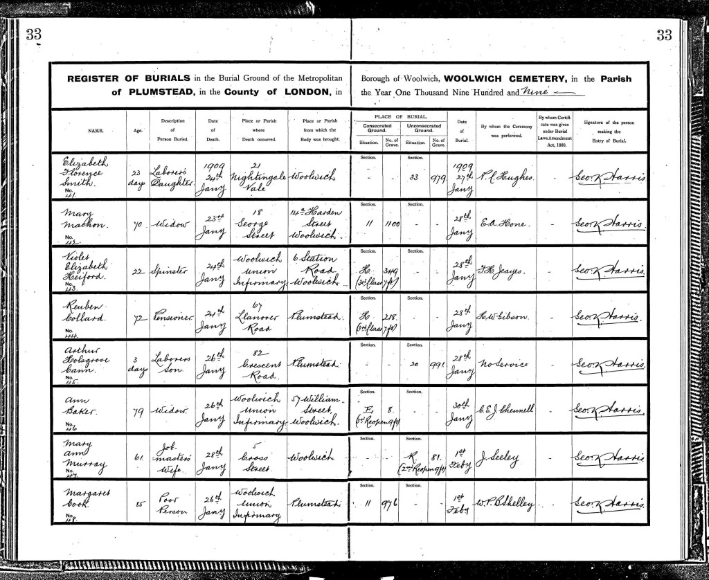 Margarita was laid to rest on Monday, the 1st of February, 1909, at Woolwich Cemetery in Greenwich, London, England. Her burial, as was often the case for those in the workhouse system, was a quiet, unremarkable affair, marked by the simplicity of the surroundings. Her final resting place was in grave reference 11/976, a grave that held not just Margarita but 13 other souls, buried together in an open grave. This shared burial reflected the realities of life in the workhouse, where the deceased, especially those who had lived through poverty and hardship, were often laid to rest in mass graves, a final resting place that offered no individual marker or personal recognition.