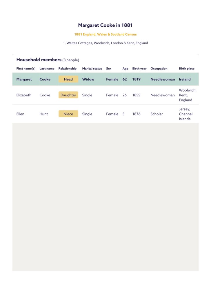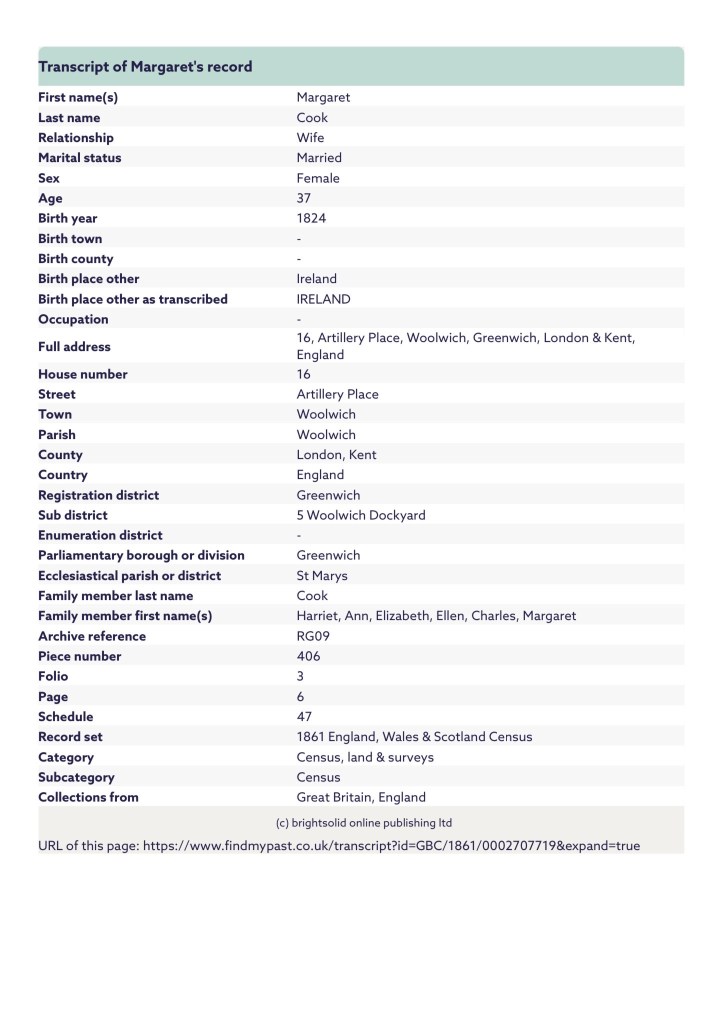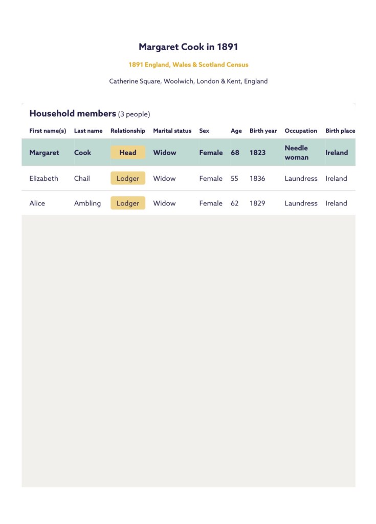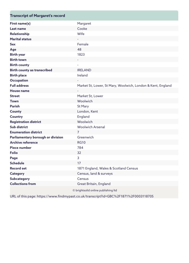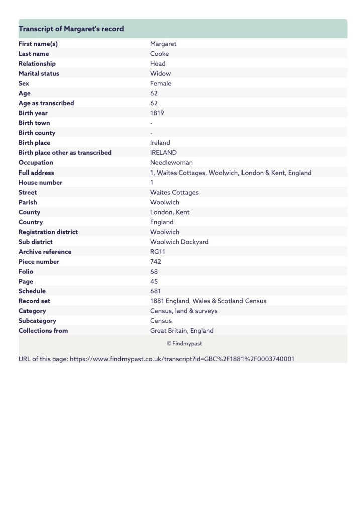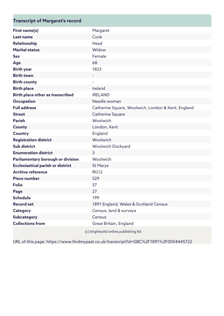 Her life was defined by the twists of fate and the struggles of her time, from her days tracing with her husband in the army, to working as a needlesomen, to a field hand in Woolwich, to her later years spent in the harsh confines of the Woolwich Union Workhouse and Infirmary. Through all of it, Margarita continued to endure, despite the many challenges that came her way. The records we have of her time, offer a glimpse into the personal story of a woman who lived through profound hardships yet carried on, never yielding to the adversity that shaped her life.