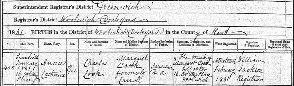 On Sunday, the 20th day of January, 1861, Margarita and Charles joyously welcomed their precious daughter, Annie Catherine Cook, into the world. Their home, nestled at 16 Artillery Place in the heart of Woolwich Dockyard, Woolwich, Kent, England, became the setting for a new chapter in their lives.