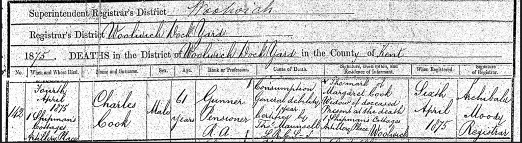 With deep sorrow, we recount the passing of Charles Cook, Margarita's devoted husband, on April 4th, 1875. At 61 years old, Charles, a former Royal Artillery Gunner who had earned a pension for his years of service, passed away at 1 Shipman’s Cottages, Artillery Place, Woolwich Dockyard, Woolwich, Kent, England. His death was attributed to consumption and general debilitation, conditions that had taken their toll on him over time.