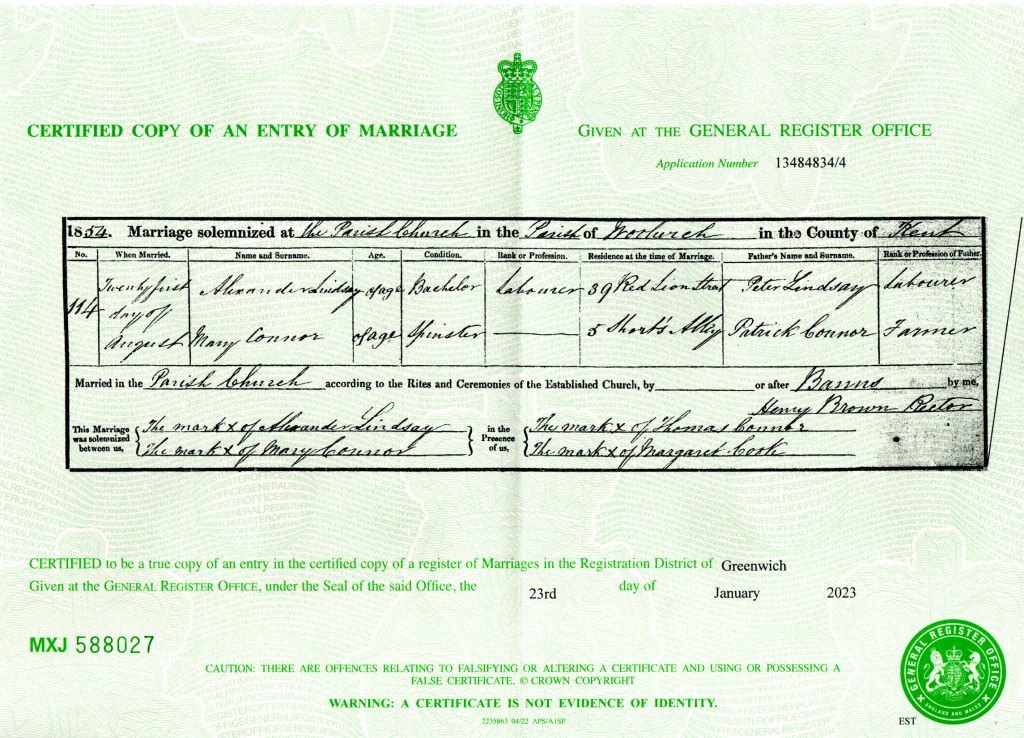 The couple provided the names of their fathers as Peter Lindsay, a laborer, and Patrick Connor, a farmer. At the time of their marriage, Mary was residing at 5 Shorts Alley, while Alexander lived at 39 Red Lion Street. The witnesses to the marriage included Margarita (listed as Margaret), who stood by her sister-in-law’s side, and Mary’s brother, Thomas Connor. This occasion further highlights Margarita’s presence at pivotal moments in her family’s life, solidifying her role in the network of relationships that shaped her personal and familial history.