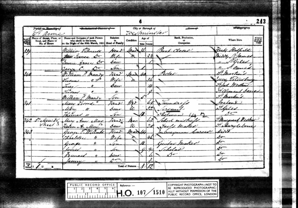 Amid these major events, on Sunday, March 30, 1851, the census was taken, and it revealed that James, along with his parents Charlotte and George John, and his siblings George, Frances, and Jenny, were living at Meard Street, Saint Anne, Strand, London, Middlesex. George John, James's father, was working as a journeyman carver, continuing the family tradition of craftsmanship.