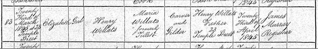 Both George and Eliza were of full age, unmarried, and living at Ann Street at the time of their marriage. George was working as a violin maker—a skilled craft that reflected his artistic nature—and Eliza’s father was employed as a tailor. George’s father, George Willats, continued his trade as a carver, a craft passed down through generations.