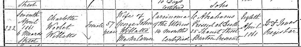 With heavy hearts, we remember the passing of James’s mother, Charlotte Woollet Willats, née Carter. Charlotte, the devoted wife of George John Willats, a master carver, and the loving mother of eight children, passed away on the 7th of April, 1861, at the age of 58.