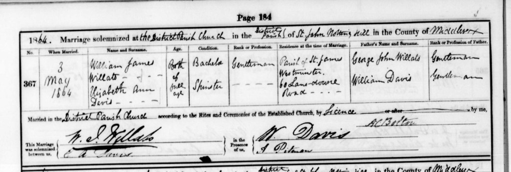 A few years later, Bachelor, James aka William James Willats, a Gentleman, married Spinster, Elizabeth Ann Davis on Tuesday the 3rd May 1864, at St. John's, Notting-Hill, Middlesex, England.