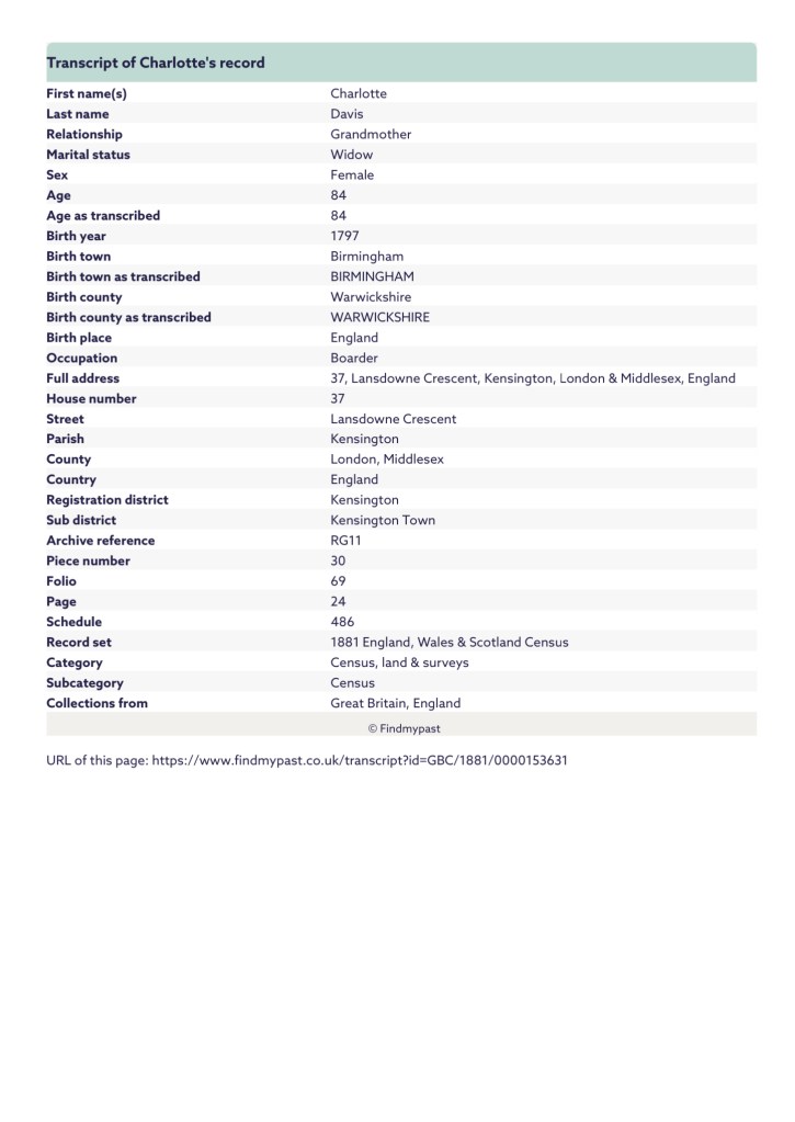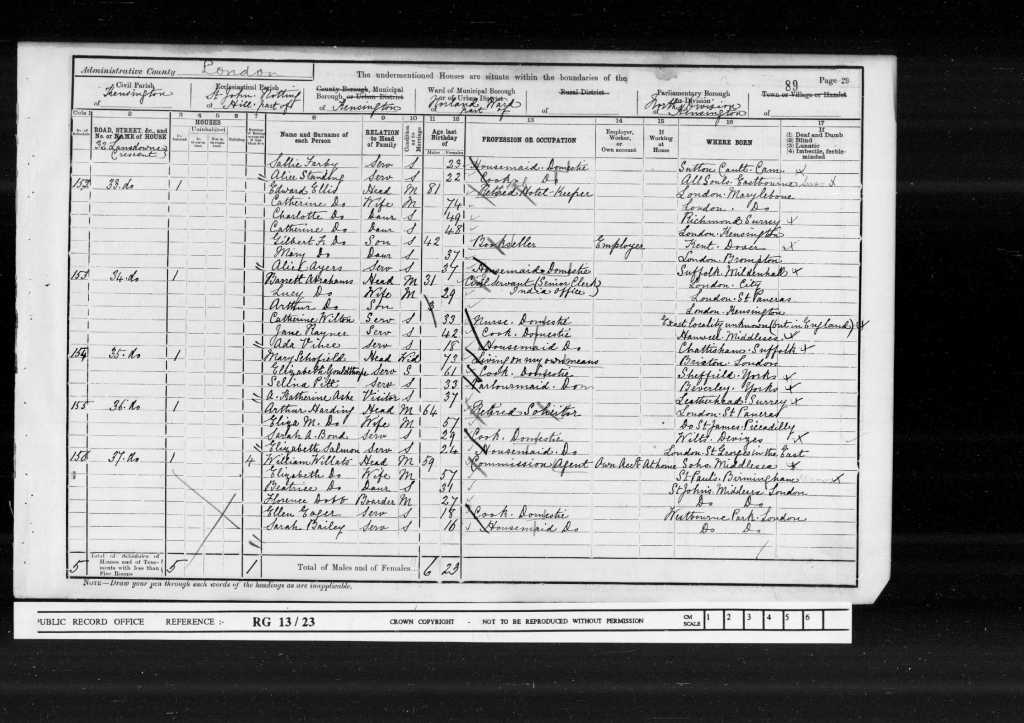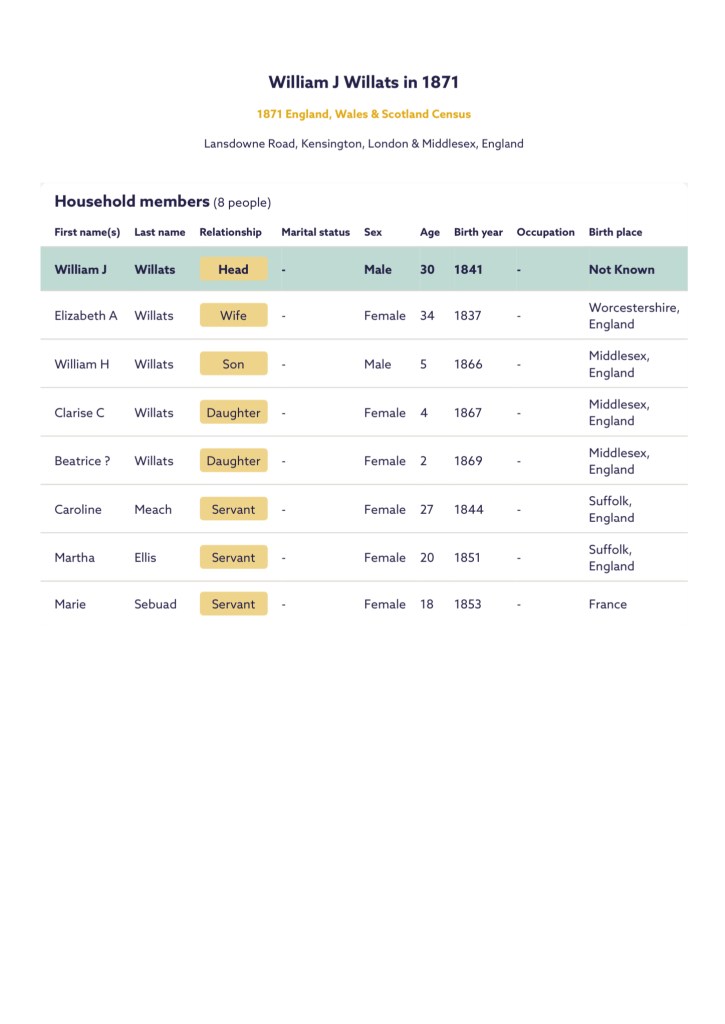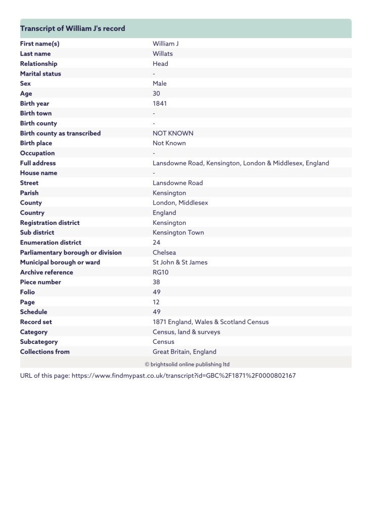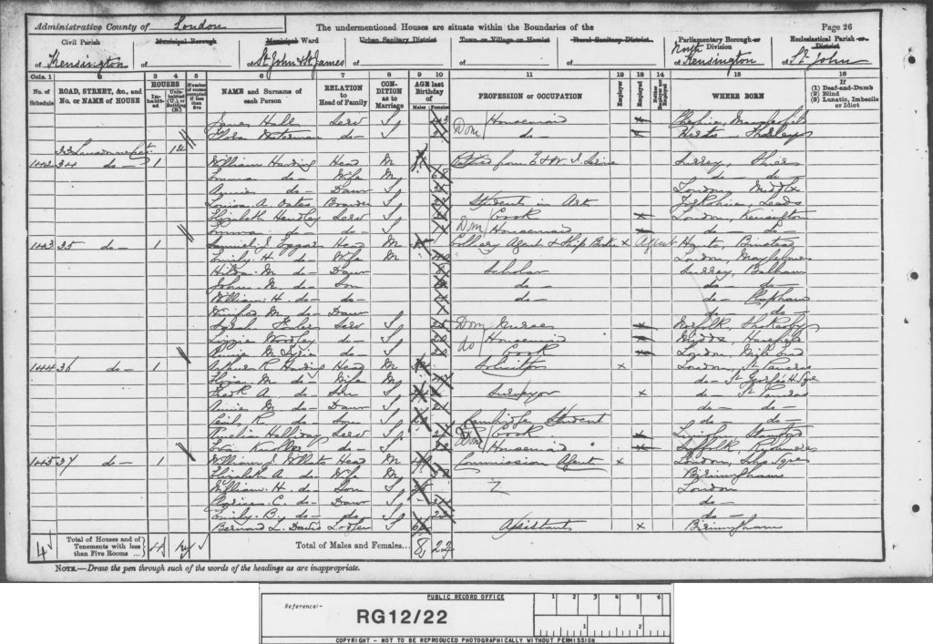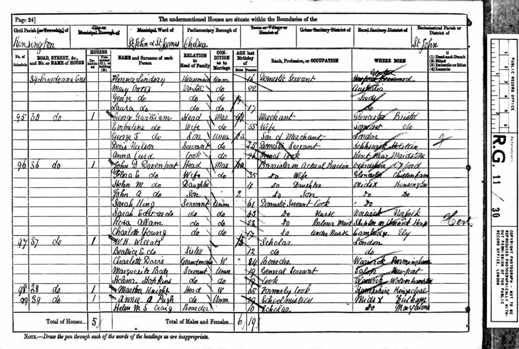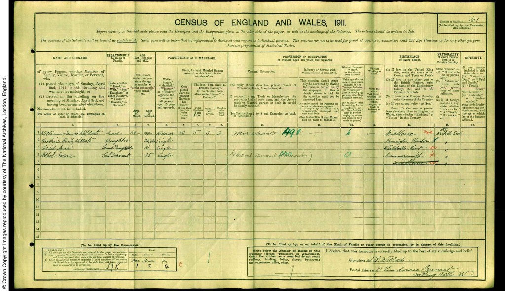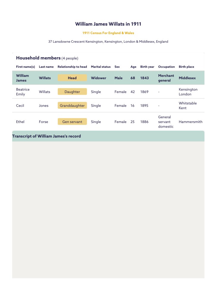 The 1921 census provides an intimate portrait of James William, his daughter Beatrice Emily Pocock (née Willats), and his granddaughter Cecil Clarice Gwyn-Jones. On Sunday the 19th day of June, 1921, the three were living together at Number 37, Lansdowne Crescent, Kensington, London, in the county of Middlesex.