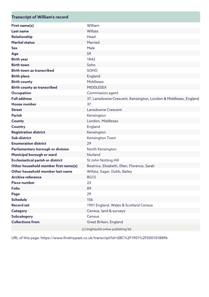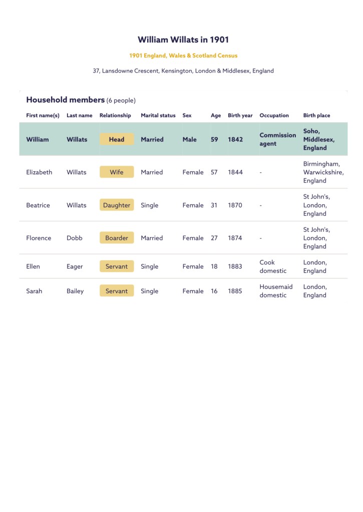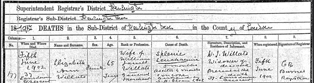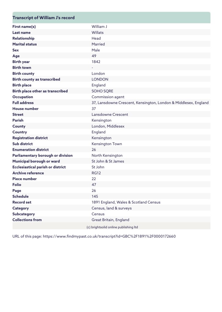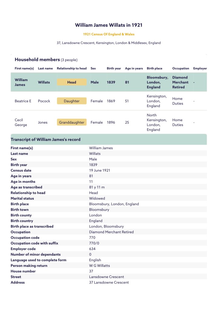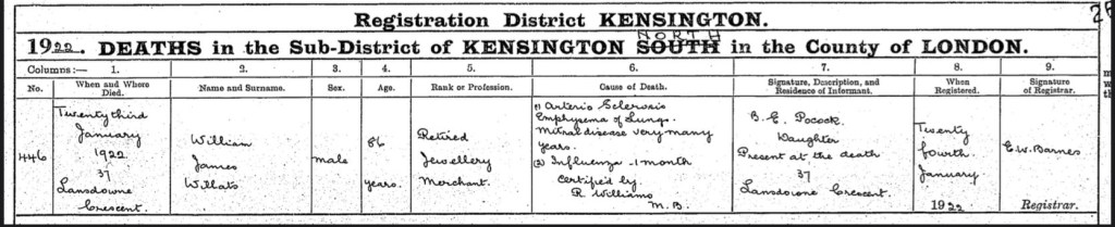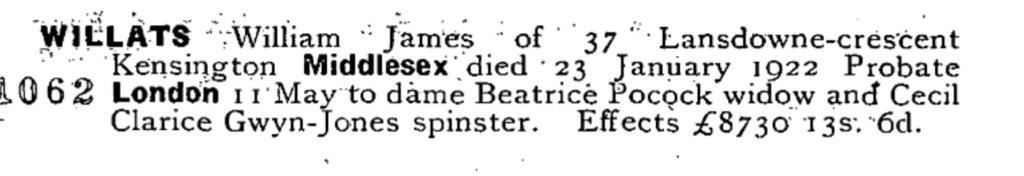 “WILLATS William James of 37 Lansdowne Crescent, Kensington, Middlesex, died 23 January 1922. Probate London 11 May to Dame Beatrice Pocock, widow, and Cecil Clarice Gwyn-Jones, spinster. Effects £8730 13s. 6d.”