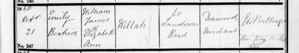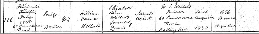 On Monday, the 13th of July, 1868, a soft cry echoed through the rooms of Number 60, Landsdowne Road, Kensington, London. It was the birth of James William and Elizabeth Ann Willats’ second daughter, Emily Beatrice Willats. The family’s home, located in the heart of Notting Hill, was about to be filled with even more joy, as the little one joined her siblings in this already lively household.