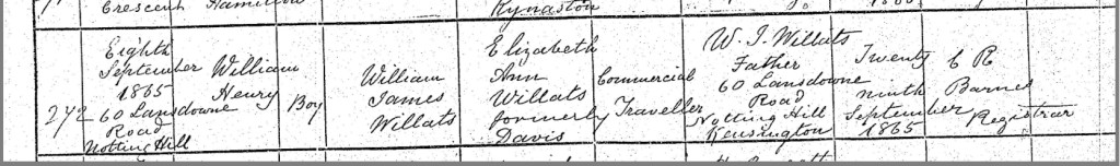 On a September day in 1865, James William and Elizabeth Ann Willats (née Davis) welcomed their son, William Henry Willats, into the world. Born on the 8th of September at Number 60, Lansdowne Road, in the heart of Notting Hill, Kensington, William’s arrival surely brought a glow of joy to the Willats household. The genteel address, with its quiet charm and promise of stability, became the backdrop for this new chapter in their family story. A few weeks later, on the 29th of September, James, ever the diligent patriarch, made his way to register his son’s birth. The official records bear his unmistakable mark of individuality: while his given name was James William, he had a habit of flipping the order, introducing himself as William James. With characteristic precision, he listed his profession as a Commercial Traveller, a role that likely took him far and wide, bringing the world into the orbit of their home on Lansdowne Road. This simple act of registration, ink on paper, became a touchstone of their lives, capturing not just the facts but the essence of a family carving out its place in the bustling tapestry of Victorian London.