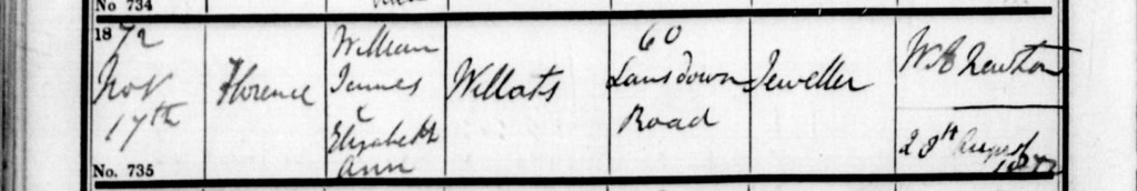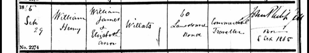 As the waters of baptism were poured, William Henry Willats was welcomed into the fold, his name ringing out with promise and hope. James, a Commercial Traveller by trade, stood alongside Elizabeth, both surely glowing with the quiet pride of young parents setting the foundations of their son’s life. Their home was listed as 60 Lansdowne Road, a genteel address that whispered of stability and a touch of aspiration.