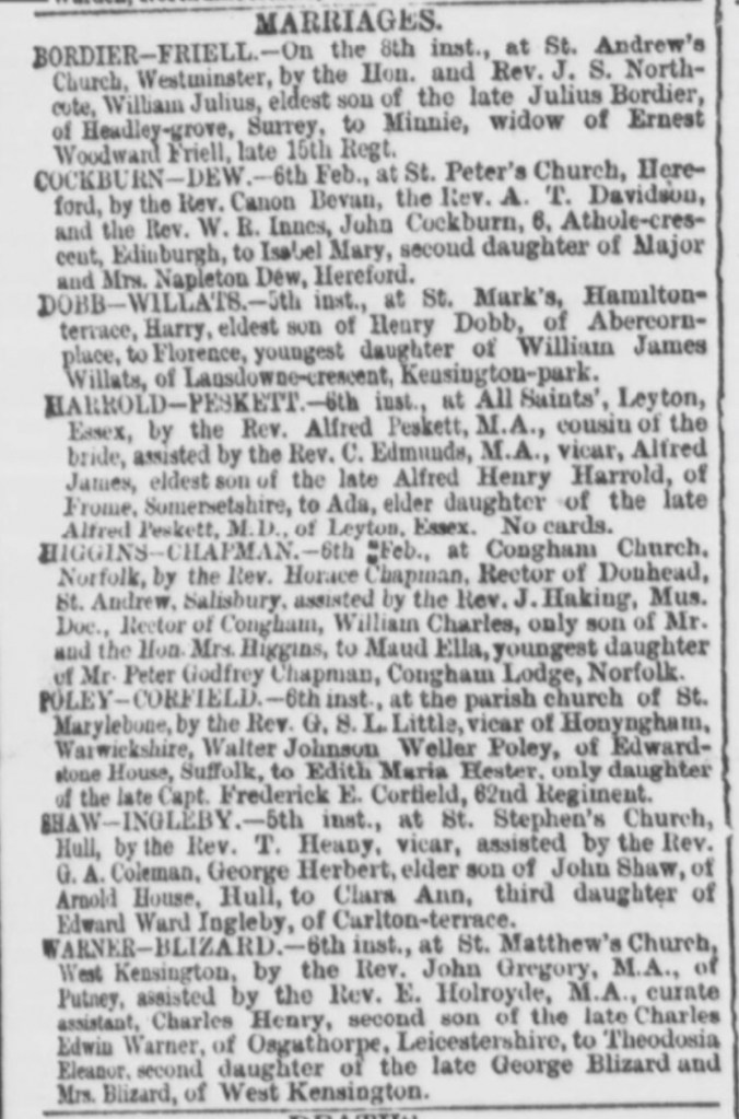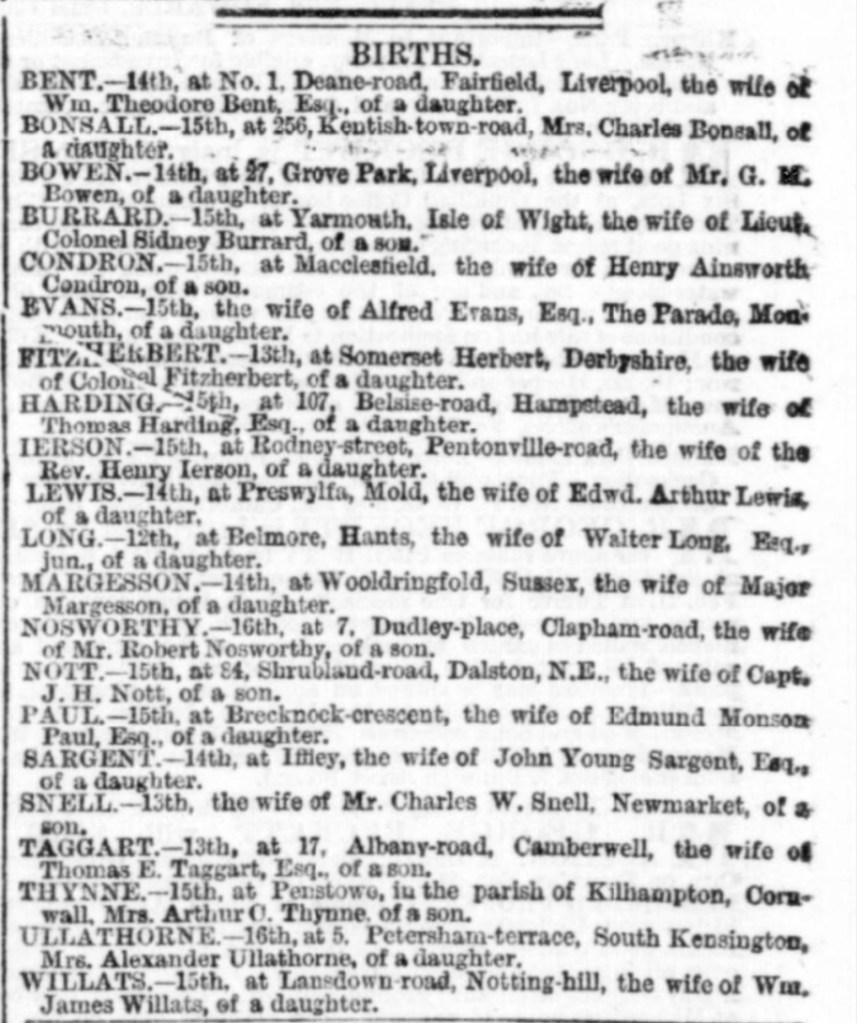 On a chilly Monday, February 18th, 1867, James William Willats, ever the proud and doting father, took a moment to share his family’s joy with the world. Nestled amidst the columns of the esteemed London Evening Standard, a simple yet heartwarming announcement appeared, bearing news of a precious arrival: **WILLATS.—15th, at Lansdown Road, Notting Hill, the wife of Wm. James Willats, of a daughter.** With these few elegant words, James made it known that his wife, Elizabeth Ann, had given birth to their daughter, Clarice, just days earlier on February 15th. The announcement, understated yet brimming with pride, carried the charm of the era, a delightful whisper of family news shared across the city. And in true James fashion, he made sure his chosen moniker, "Wm. James Willats," added a distinctive flair to the occasion, an enduring reminder of his penchant for swapping his names. From their home at Lansdowne Road, Notting Hill, the Willats family’s joy was now inked for posterity, a small yet enduring detail in the grand story of their lives.