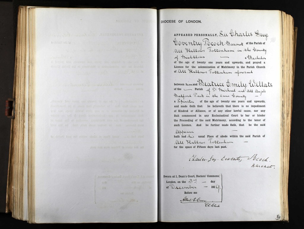 Their marriage bonds had been called on Wednesday the 3rd of December 1919, at 1 Dean’s Court, Doctor’s Commons, London, England.