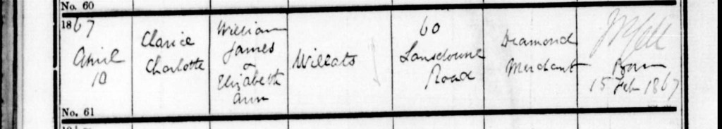 On a winter Friday, February 15th, 1867, beneath the bustling skies of Kensington, London, a new chapter began for James William and Elizabeth Ann Willats (née Davis). Their daughter, Clariss Charlotte Willats, arrived into the world at the family home, Number 60, Lansdowne Road. The stately street, known for its elegance, became the setting for the debut of a little girl destined to carry the charm of her name into the future.