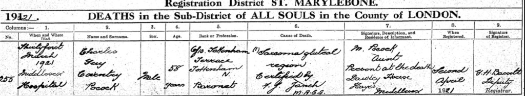 James’s Son In-Law, Sir Charles Guy Coventry Pocock, died on Thursday the 31st of March, 1921, in Marylebone, Middlesex, England, when he was 58 years old.