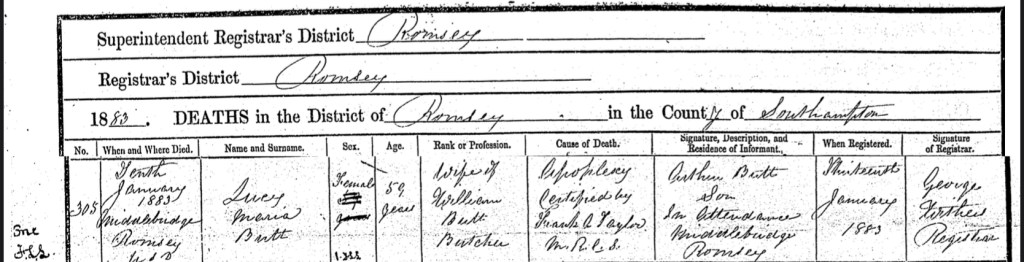 As we all know, there are only two certainties in life, we are born, and we die. In January 1883, one of those certainties became a harsh reality for Arthur Henry Butt and his family. On Wednesday, the 10th of January 1883, Arthur’s mother, Lucy, passed away in Middlebridge, Romsey, Hampshire. Lucy died at the age of 59 from apoplexy, a sudden and often fatal condition caused by a stroke or severe bleeding in the brain. Her death marked the end of a chapter in the Butt family’s history.