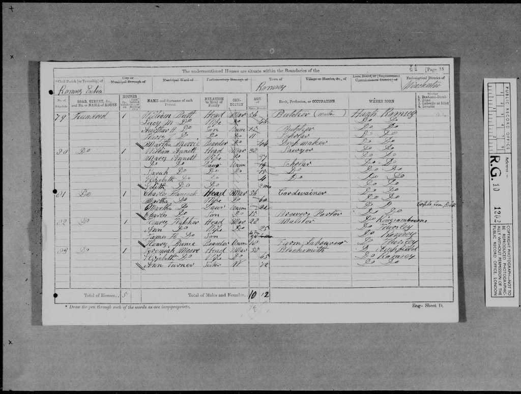 On the day of the census, Sunday, 3rd April 1881, Arthur, his wife Fanny, and their children Ernest, Horace, and Sydney were residing at Middlebridge Street, Romsey, Hampshire, England. The family’s home was also the location of Arthur’s butcher shop, and as was typical for many families in this period, their residential and working spaces were closely linked. Arthur was working from home as a master butcher, employing one boy to assist him in the daily operations of the business.