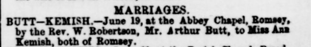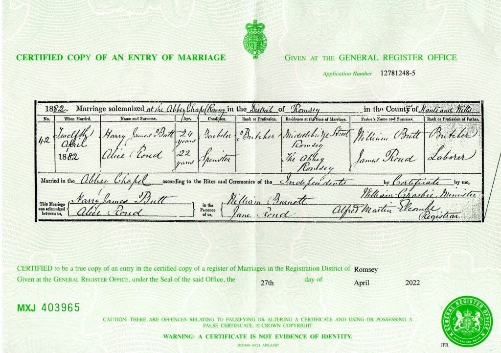 Arthur’s brother, Harry James Butt, a bachelor, married Alice Roud (My 4th cousin, 4 times removed), a spinster and daughter of James Roud and Mary Roud (née Martin), on Wednesday the 12th of April 1882. Harry was 24 years old at the time of the marriage and worked as a butcher, much like his father, while Alice was 22 years old. The marriage took place at The Abbey Chapel in Romsey, Hampshire, a significant landmark in the town, marking the beginning of a new chapter for the couple.