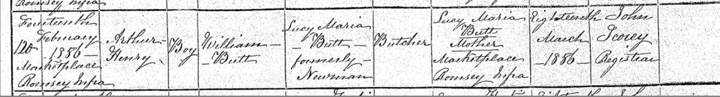 Arthur's brother, Harry James Butt, my husband's great-great-grandfather and the husband of my fourth cousin four times removed, was born on Saturday, the 29th of May 1858, at Market Place, Romsey, Hampshire, England. He was the son of William Butt, a butcher, and Lucy Maria Butt, née Newman. At the time of Harry's birth, the Butt family continued to reside at Market Place, Romsey, a location deeply entwined with their trade and livelihood.
