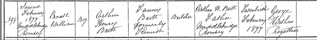 Arthur and Fanny’s son, Ernest William Butt, was born on Friday the 2nd of February 1877 at Middlebridge Street, Romsey, Hampshire, England. His arrival marked the next generation of the Butt family, who had long been established in the town. Just weeks later, on Monday the 26th of February 1877, Arthur himself registered Ernest’s birth in Romsey, officially documenting his son’s place in the family’s history.