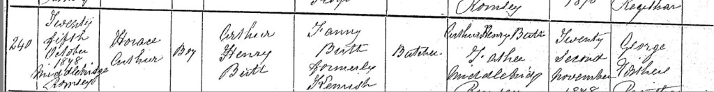 Arthur and Fanny’s son, Horace Arthur Butt, was born on Friday, the 25th of October 1878, at the family home on Middlebridge Street, Romsey, Hampshire, England. His birth added another branch to the growing Butt family, further cementing their presence in Romsey. Nearly a month later, on Friday, the 22nd of November 1878, Arthur once again took on the duty of registering his son’s birth in Romsey, ensuring that Horace’s place in the official records was secured.
