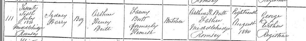 On Wednesday, the 18th of August 1880, Arthur registered his son Sydney’s birth in Romsey. The registrar, George Withers, recorded that Arthur’s occupation was a butcher, a trade that had been passed down through generations. The family’s residence was also noted to be on Middlebridge Street, where Arthur worked, further connecting their home to the local market and their livelihood. The record also confirmed that Sydney’s mother, Fanny, had been Fanny Kemish before her marriage to Arthur, preserving her maiden name in the official record.