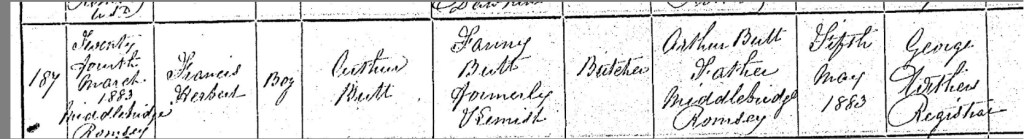 The birth registration once again confirmed that Francis’s mother, Fanny, maiden name was Fanny Kemish. Francis Herbert Butt’s birth added another chapter to the Butt family’s legacy in Romsey, and like his siblings before him, he would grow up in the vibrant community that his family had been a part of for many years.