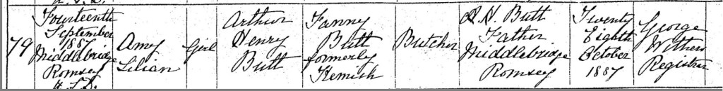 Arthur, as the informant, registered Amy Lilian’s birth on Friday the 28th of October 1887, in Romsey. The registrar, George Withers, recorded that Arthur’s occupation was a butcher, a continuing reflection of the family’s long-standing involvement in the trade. The family’s residence was again noted as being on Middlebridge Street, Romsey, underscoring the family’s established roots in the area.