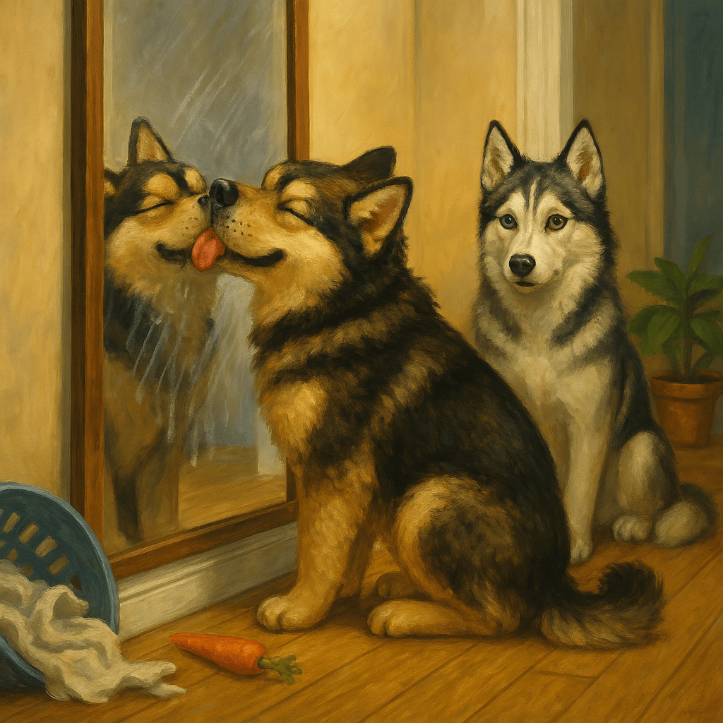 From that day on, the mirror was lovingly referred to as Obito’s “special friend.” It was eventually moved back to its original corner, mostly to prevent further romantic incidents. Obito never truly got over it. Even now, whenever he walks past a window or catches sight of himself in a shiny oven door, he pauses. He tilts his head. He wags his tail.